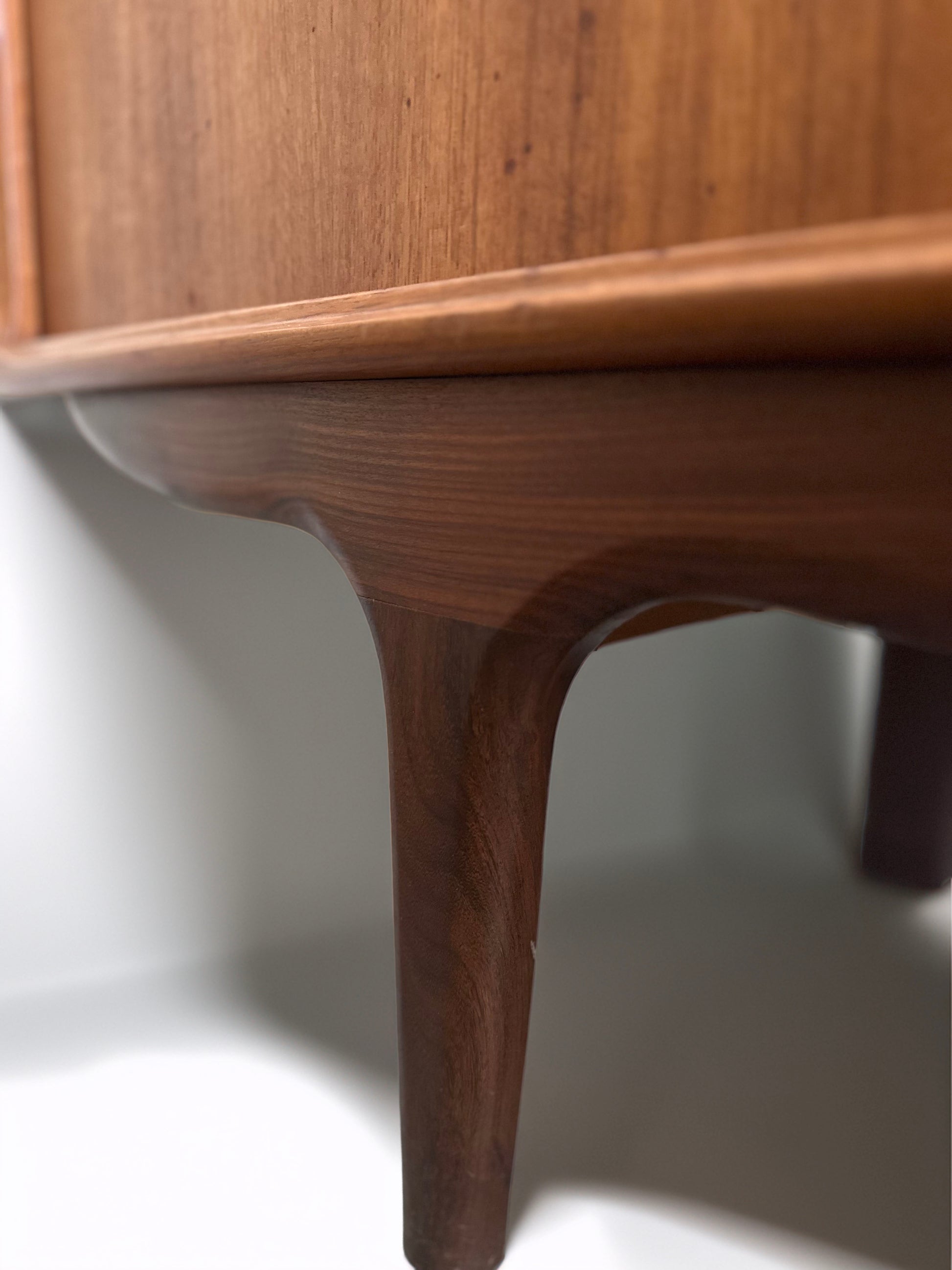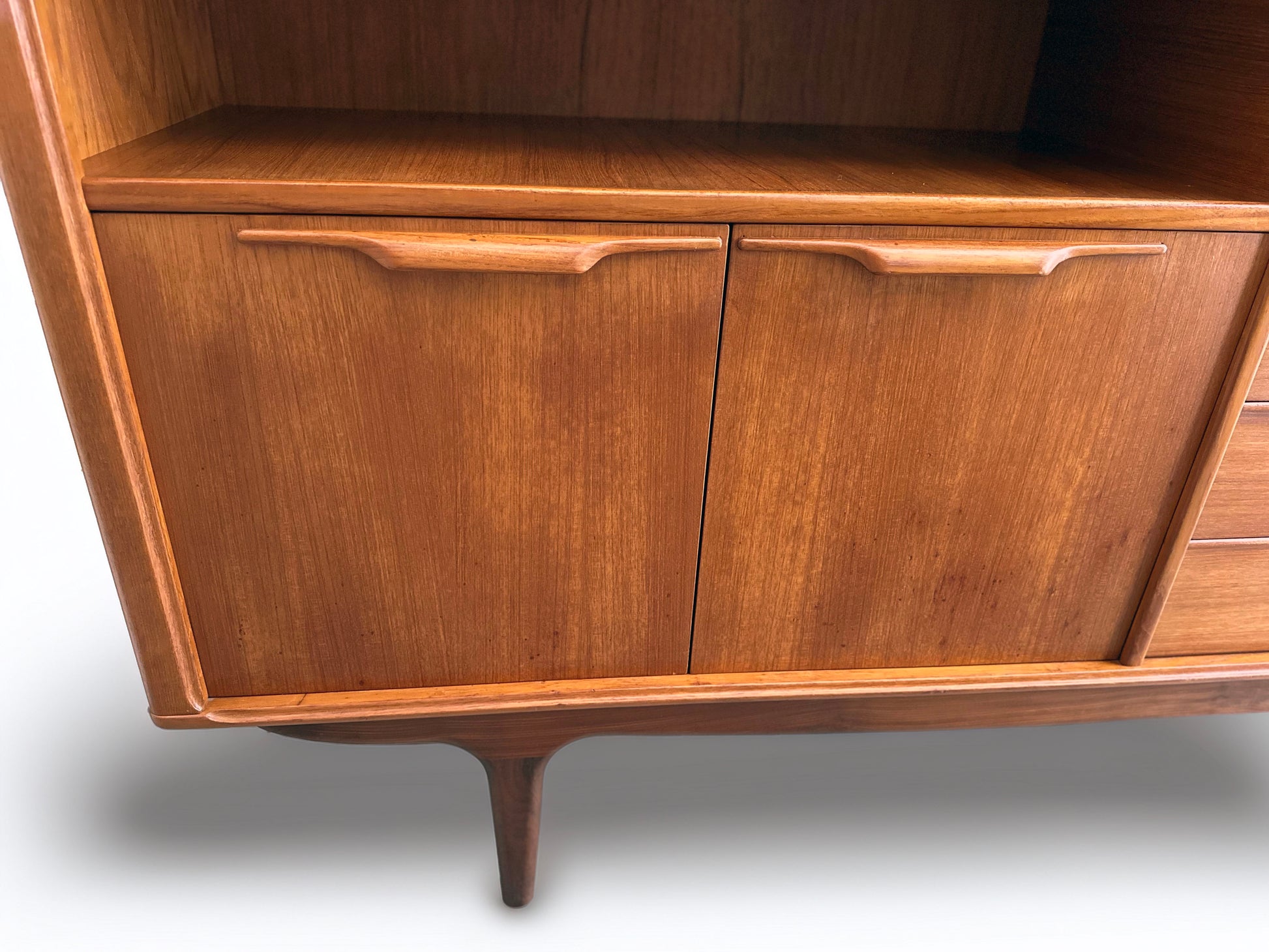 Mid-century highboard from the 1960s in teak. This piece showcases the clean lines and organic warmth that define Scandinavian design. Different elements (legs, handles, overall design) indicate that this piece was designed by Johannes Andersen and distributed by the French Samcom.
