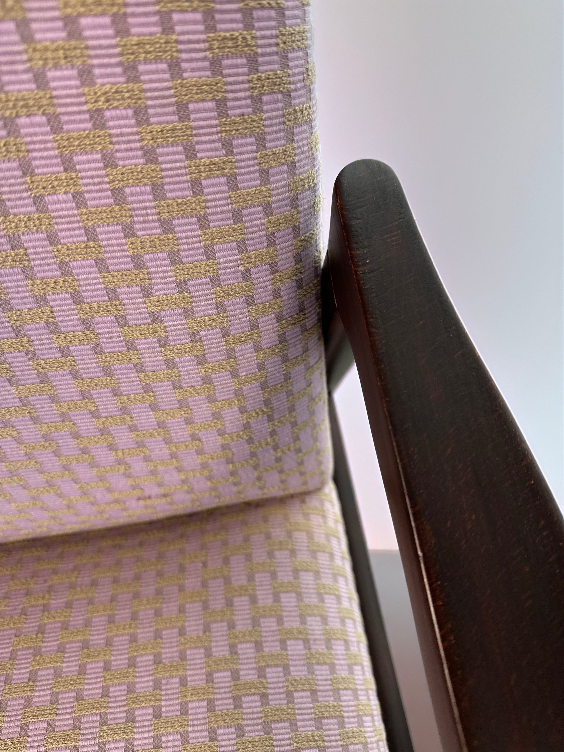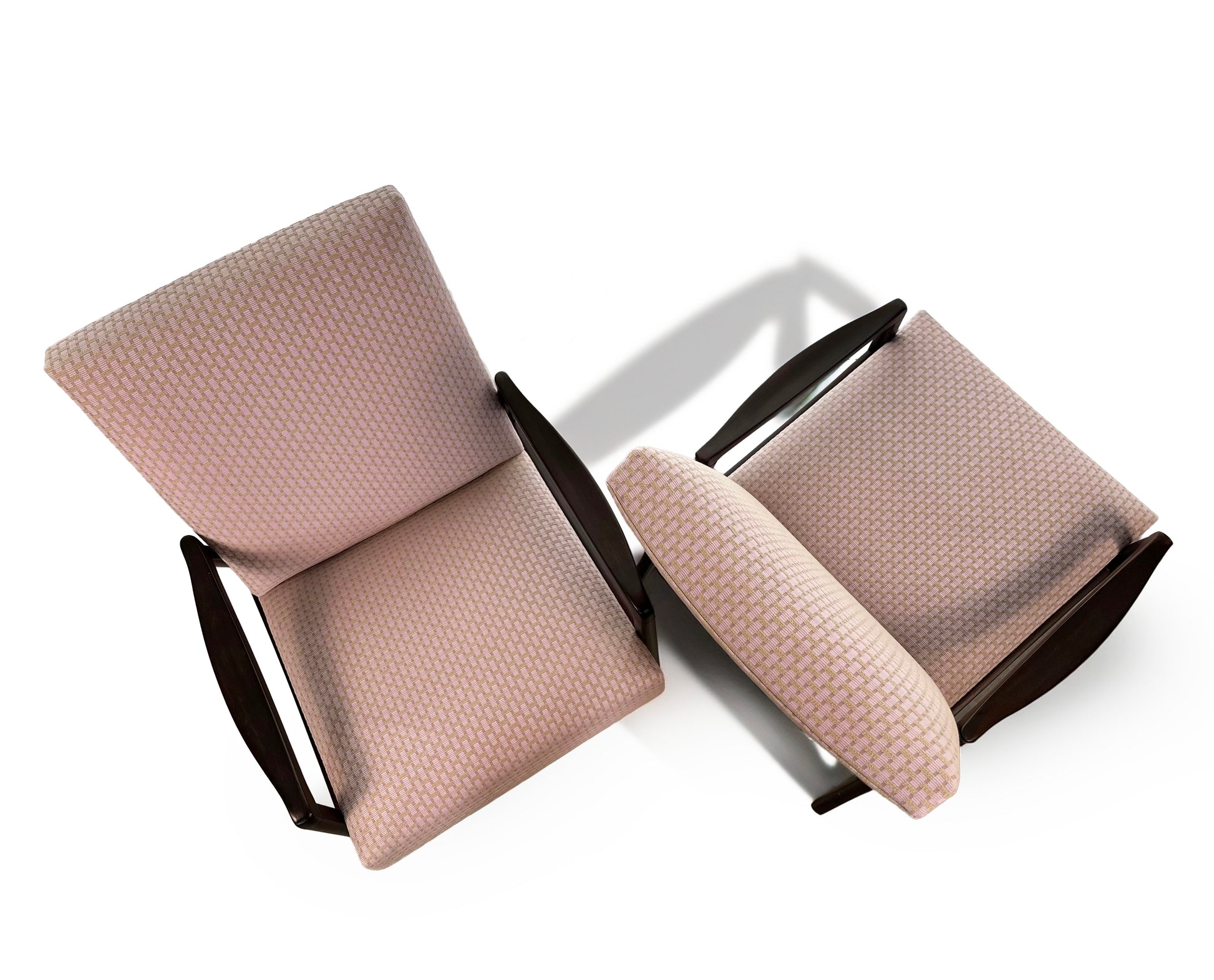 The chairs feature dark brown solid wooden frames with gracefully curved armrests that give them a light, airy presence. The seats are upholstered in a light pink/lilac fabric (see photos for detail).