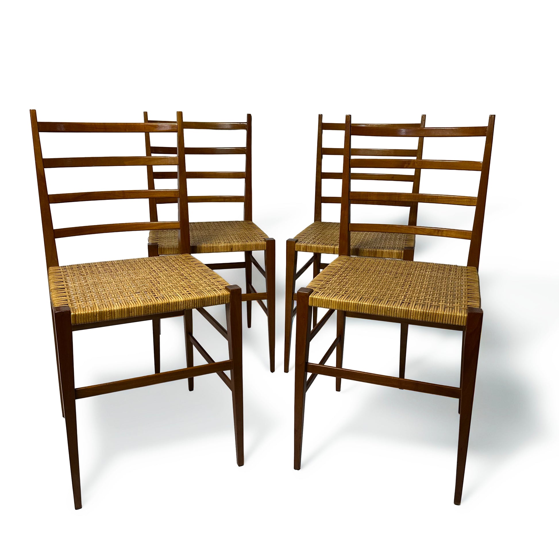 Set of four beautifully elegant vintage Italian ladder-back chairs, 1950s–60s, in the style of Gio Ponti’s Superleggera.