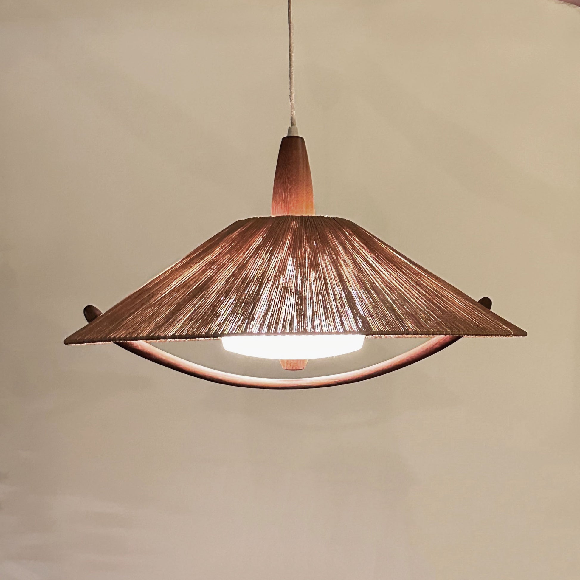 This lamp features a beautifully woven lampshade that creates a warm and inviting ambiance. The combination of natural materials such as cord and sculptural wooden elements gives it an elegant yet organic aesthetic, perfect for Scandinavian, bohemian, Japandi or vintage interiors.