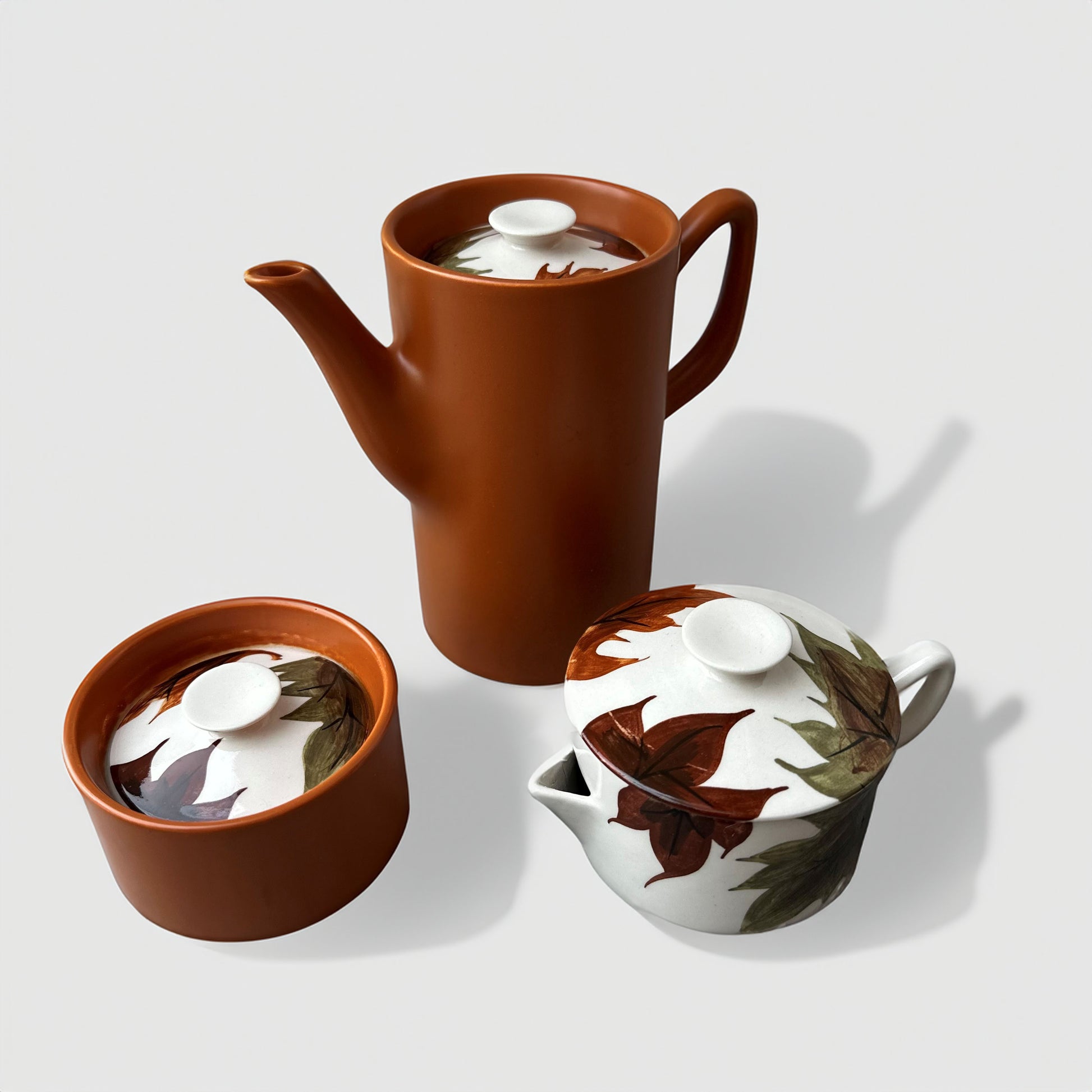 The striking burnt sienna glaze paired with delicate autumn leaf motifs makes every piece a celebration of nature and seasonality. Each saucer features a unique leaf composition in warm earthy tones—rich browns, deep greens, and crisp ochres—reminiscent of leisurely afternoons and slow sips in the golden light of fall.