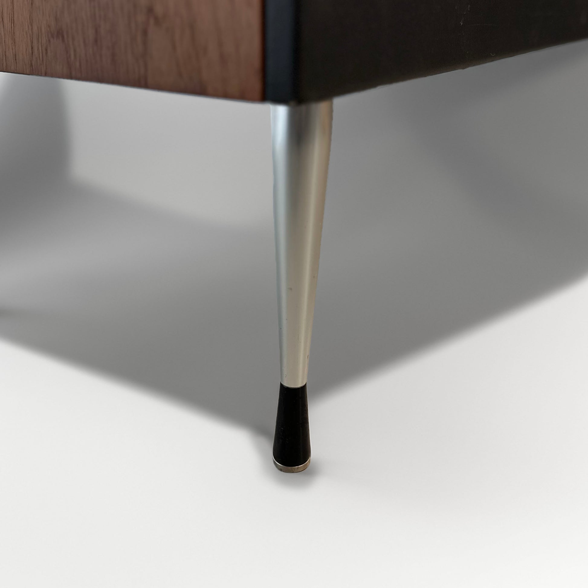 Features 4 spacious drawers, warm wood finish, black plinth with tapered metal legs