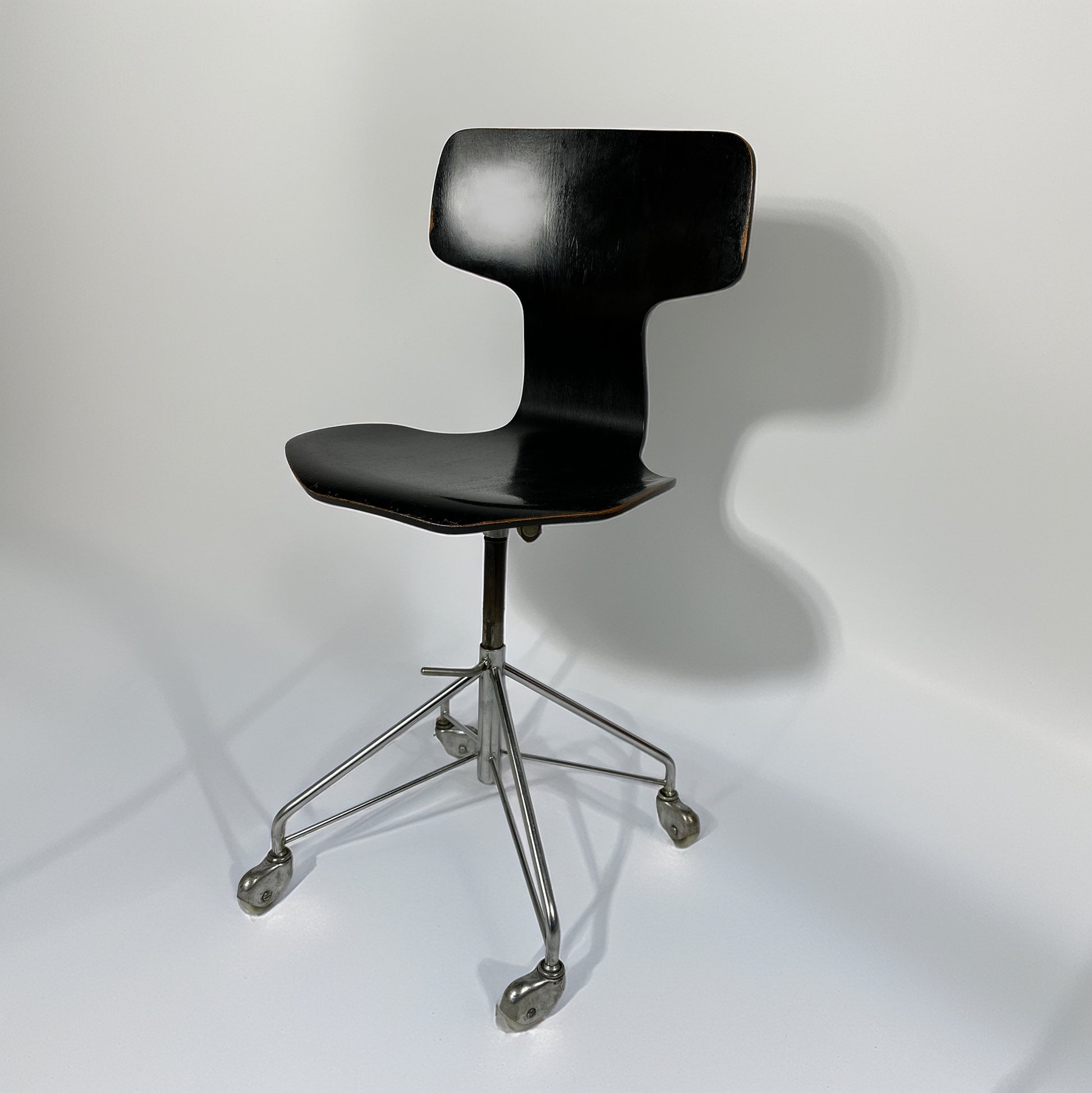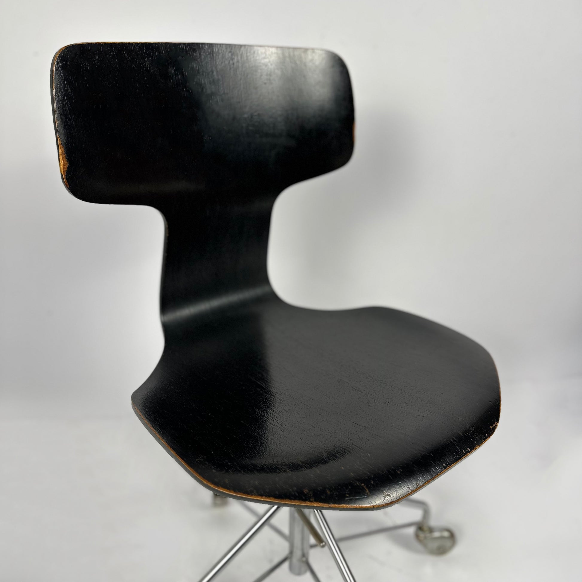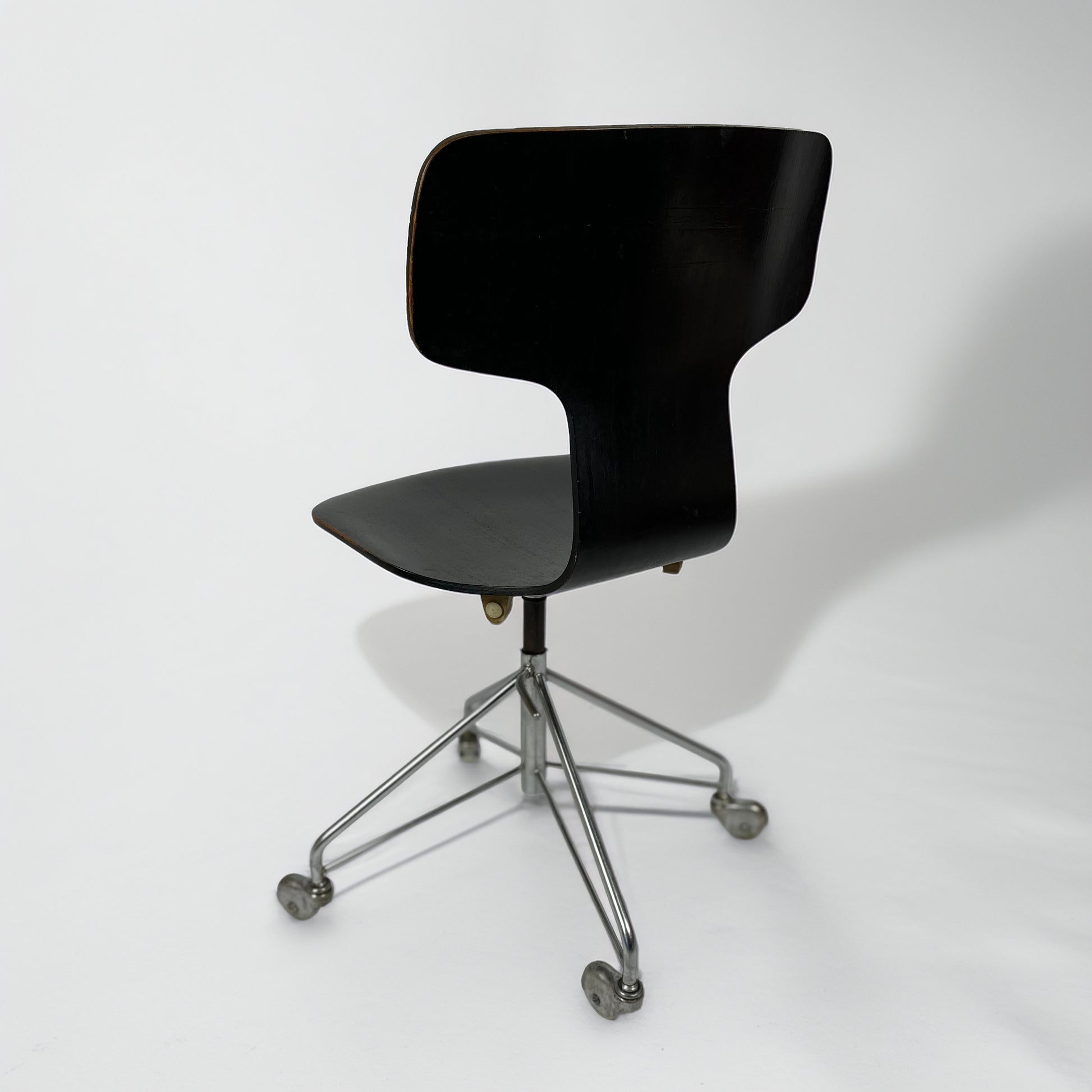 This elegant desk chair belongs to Jacobsen’s celebrated 3100 series and perfectly embodies the refined minimalism of Scandinavian modern design. The sculptural moulded plywood shell with its distinctive T-shaped backrest combines comfort, ergonomics and timeless aesthetics.